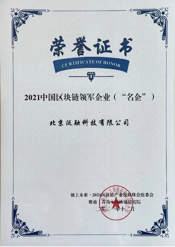 2021中国区块链领军企业(“名企”)证书由链上未来·2021区块链产业开展峰会组委会、赛迪(青岛)区块链实验室联合颁发。